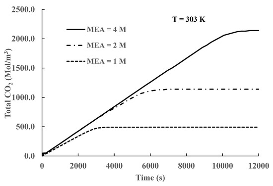 The calculated results presented in Table 2 show that an increase in the initial MEA concentration results in a lower CO2 load. In Figure 12, we plot the total CO2 concentration for different initial MEA concentrations. It is shown in Figure 11 that there is a significant increase in the total CO2 concentration values with increasing initial MEA concentrations. However, the results presented in Figure 11 also show that there is a significant increase in the time needed to reach equilibrium. Inspection of the results reported in Table 2 also shows that there is a decrease in the CO2 load as the initial MEA concentration increases. To reach an optimum absorption process, these effects must be considered carefully because they work in opposite directions. Operation at low initial MEA concentrations produces higher loads, and equilibrium is reached faster; therefore, several batches can be run during the operation time of a higher MEA concentration process. A higher initial MEA concentration operation, however, absorbs a higher amount of CO2 than a lower initial MEA concentration process; therefore, during the required MEA regeneration step, significant savings may be achieved by dealing with one batch of a concentrated solution and not several batches of a more dilute solution, with all batches having similar volumes. It is beyond the scope of this study to conduct a quantitative analysis of the costs involved; however, the presented results support the use of temperature manipulation to increase CO2 absorption and lower operating costs.