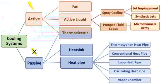 Cooling systems for electronic packages can be broadly categorised into active and passive cooling systems, or a combination of both. Figure 3 provides an overview of the main classifications of active and passive thermal management systems commonly used for cooling PES units. Passive cooling systems, which rely on natural convection, conduction, and radiation, offer a practical solution for managing heat in electronic packages without the need for power consumption []. In contrast, traditional cooling techniques involving active cooling systems with fans and vents for forced convection present challenges in terms of miniaturisation, airtightness, power efficiency, and cost effectiveness, particularly in compact and high-power designs of PES units and electronic packages [,,].