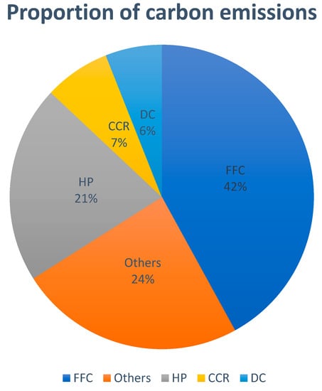Proportion of carbon emissions from refinery processes. Notes: FCC—fluid catalytic cracking; DC—delayed coking; CCR—Continuous Catalytic Reforming; HP—Hydrogen production.