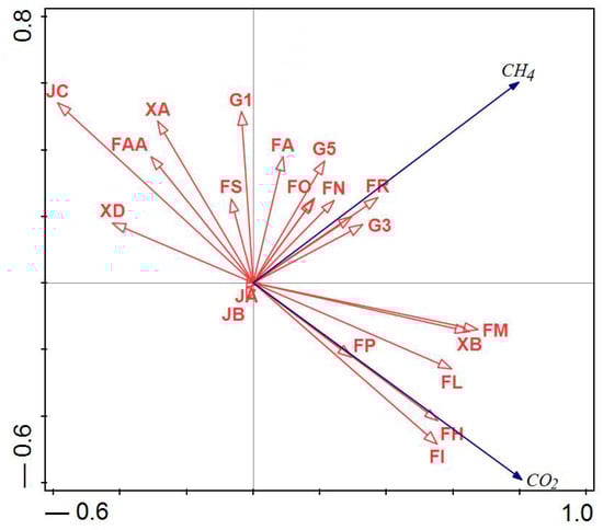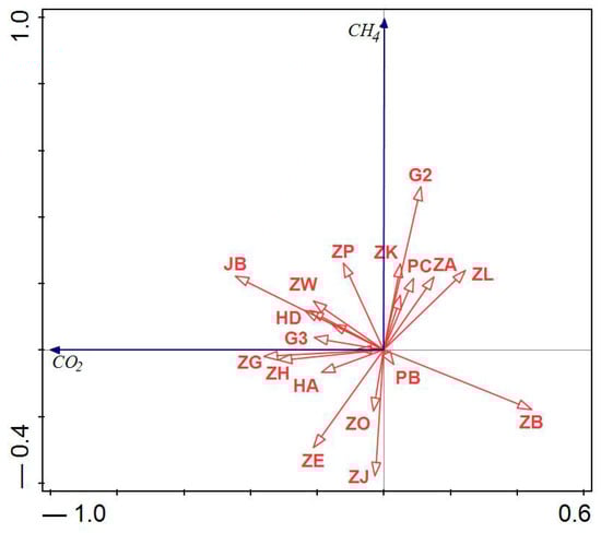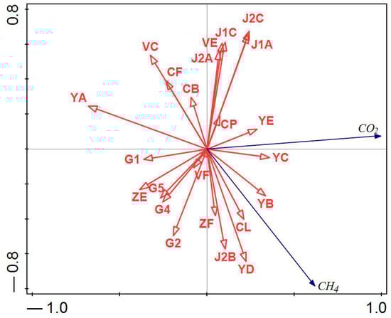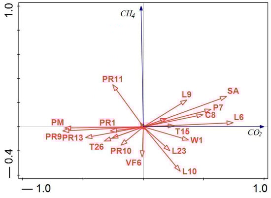 Diagram of the redundancy analysis (RDA) presenting the correlations between the GHG emission (CO2, CH4) and process parameters of the DC unit.