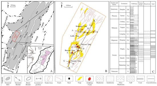 PH and HF are both primary-source rock formations, as well as the main reservoirs. The characteristics of interbedded sand and mudstone between the two formations in the vertical direction make it possible to obtain good source–reservoir–cap assemblages in this area. In addition, as shown in Figure 1, the deep and large fault system that has developed in the Pingbei area can not only act as an oil and gas migratory channel but as an effective oil and gas accumulation space, together with the strata, under certain conditions.