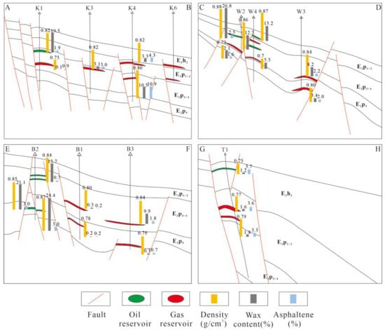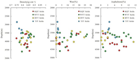 The density of the crude oil (Table 1) was between 0.75 and 0.90 g/cm3, which is the density of light-medium crude. The wax content had a wide distribution range, ranging from 0.07% to 26.81%, and it was mainly medium-high wax crude oil. The content of asphaltene was 0.17%~14.19%. In general, the physical properties of the crude oil in the north oil and gas fields of the Pingbei area were higher than those in the south (Figure 3). Moreover, as seen in Figure 3, that the density and wax content of most of the oil and gas fields that were in, respectively, vertical directions were characterized by shallow formations that were higher than the deep formations.