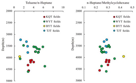 The light hydrocarbon parameters of the crude oil in the Pingbei area also showed similar vertical differences (Table 2, Figure 4). Crude oil generally contains a relatively high number of cycloalkanes, its toluene/n-heptane distribution ranges from 1.10 to 6.25, with an average value of 3.77, and its n-heptane/methylcyclohexane distribution ranges from 0.23 to 0.43, with an average value of 0.28. In our study, as the crude oil’s depth decreased, some WYT and KQT fields showed increases in toluene/n-heptane and decreases in n-heptane/methylcyclohexane, indicating that the shallow crude oil was relatively heavier and richer in aromatics. This phenomenon had good consistency with the density of the crude oil in this oil and gas field.