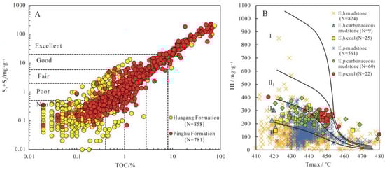 Cross diagram of the TOC versus Rock-Eval S1+S2 (A) and the Rock-Eval Tmax versus HI (B).