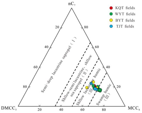 Hu Tilin et al. [18] compared the geochemistry characteristics of source-rock-adsorbed hydrocarbons and natural gas light hydrocarbons and found that the C7 series of compounds could be used as a good index for identifying the genetic types of oil and gas. As shown in Table 2 and Figure 7, we could see that the content of methyl cyclohexane (MCyC6) in the Pingbei crude oil samples was absolutely dominant, with values of between 55% and 69%. The contents of dimethyl cyclopentane (DMCyC5) and n-heptane (nC7) were relatively low, with values ranging from 15~26% and 16~25%, respectively. The results showed that the source rocks’ deposition environments were swamp facies and shallow lake facies, and their type was humic organic matter (III). Previous studies have shown [1] that the crude oil in the Pingbei area of Xihu Sag had high ratios of pristane to phytane (Pr/Ph of 3.6~8.2), and the C29 steranes in the C27, C28, and C29 regular steranes were relatively dominant, as were the distribution characteristics of diterpenoids, oleanane, and retene, which represented the source of the high terrestrial plants. The characteristics of the above biomarkers were consistent with the source rocks’ deposition environments and type revealed by the light hydrocarbons, indicating that crude oil was formed in a highly oxidized lacustrine and swamp sedimentary environment, it was formed by humic organic matter.