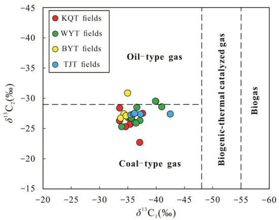 The carbon isotope of methane (δ13C1) and the carbon isotope of ethane (δ13C2) are often used as indicators to identify the genetic type of natural gas. For example, δ13C1 < −55‰ indicates biogenic gas, its opposite indicates pyrolysis gas (where −55‰ < δ13C1 < −48‰ indicates biogenic-thermal catalytic transition zone gas), δ13C2 < −29‰ indicates oil-type gas, and all others indicate coal-type gas [19,20]. As shown in Figure 8, the natural gas samples in the study area were mainly located in the coal-type gas area, and few fell into the oil-type gas area, shownig that the natural gas was mainly generated by humic organic matter.