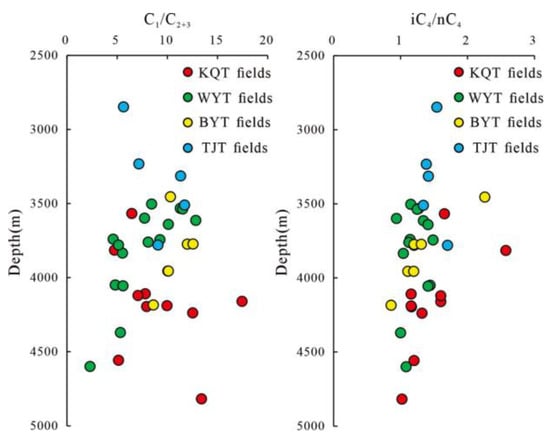 The composition of natural gas contains rich geochemical information. The differences in the chemical properties between isobutane and n-butane often lead to the tendency toward “isobutylation” in the migration process of natural gas. Therefore, other researchers have often used iC4/nC4 as a natural gas migration index [43,44,45]. In addition, since methane (CH4) has stronger permeation and diffusion abilities compared with ethane (C2H6) and propane (C3H8), the value of C1/C2+3 gradually increases along the migration direction, and so other researchers have also commonly used C1/C2+3 to consider the migration process of natural gas [43,45]. The change in the natural gas migration index in the Pingbei area is shown in Figure 12. It can be seen that from deep to shallow, the values of the iC4/nC4 and C1/C2+3 gradually increase, revealing the characteristics of the gas migration primarily in the vertical direction in the Pingbei area. In addition, wells K4–K6 at KQT, W3–W4 at WYT, and B1–B3 at BYT showed lateral transport features.