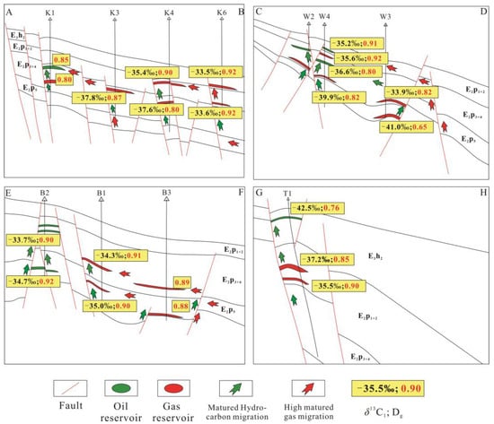 As previously mentioned, the δ13C1 and Dg of the hydrocarbon reservoirs in the Pingbei area (except TJT) are generally heavier in the shallow areas than in the deep areas along the dip of slope (Figure 13). Because these reservoirs belong to late-stage accumulations, the thermal evolution of the source rocks within the slope has not reached the high-maturity stage and cannot provide natural gas with high maturity (heavier δ13C1 and higher Dg). The late-stage gas in the area would have been transported from gas formed from highly mature hydrocarbon source rocks in the deep sub-concave to the east along the reservoir of the fracture and slope, thus creating the characteristic of a shallow slope with a heavier δ13C1 and a higher Dg than the deeper inner part. The authors of [44] believed that the δ13C of natural gas undergoes a certain degree of fractionation during the migration process, resulting in the gradual lightening of the δ13C along the migration direction. The TJT hydrocarbons were judged to be vertically transported according to the transport parameters. As the depth decreased, they showed the characteristics of a lighter δ13C1 and a lower Dg, and the carbon isotope changes were consistent with the characteristics of the transport fractionation. At the same time, the Ro, δ13C1, and Dg of the natural gas along the transport direction became smaller due to the effects of hydrocarbon source rock thermal evolution and hydrocarbon exhaustion. This indicated that the differences in the TJT hydrocarbons were mainly controlled by the production-exhaustion effects. The characteristic where hydrocarbons are transported laterally on slopes and vertically at depth is also supported by the actual geological conditions, and researches [2,46] have shown that in the early depositional stage of PH, the fault activity was strong, the fault-controlling strata developed obviously, and the sand body connectivity was generally poor. Therefore, deep natural gas primarily migrates vertically along faults, creating the characteristics of the “deep, scattered and small” oil and gas reservoirs that are found in the Pingbei area today. From the late PH to HF, the fault activity became weaker, and the faults no longer obviously controlled the development of the strata. At the same time, with the decrease in sea level and the advancing of the rivers toward the sea, the sand bodies were widely developed and had good lateral connectivity, which could be used as a good channel for the lateral migration of gas. In addition, due to the large burial depth and the adjacent hydrocarbon generation sub-sag in the lower part of the study area, the source rocks had generally entered a high-maturity stage, and the hydrocarbon supply conditions were more favorable. Hence, through the above analysis of the natural gas composition and isotopic distribution characteristics in the Pingbei area of Xihu Sag, it was shown that the natural gas in the study area mainly migrated vertically and was supplemented by lateral migration.