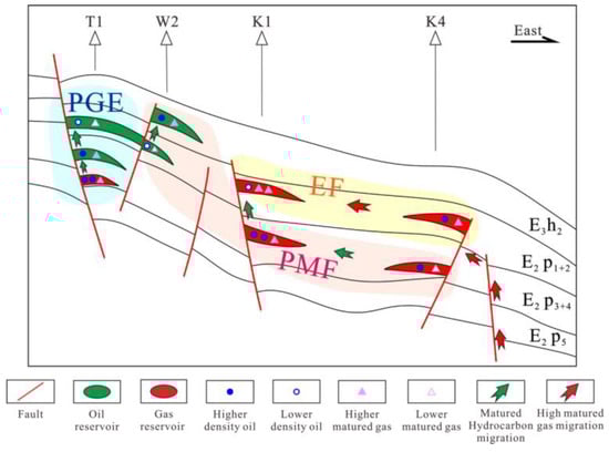 In summary, there are three mechanisms controlling the genesis of the complex hydrocarbon phase states in the Pingbei area of Xihu Sag (Table 7, Figure 14). (1) The PGE leads to the shallow hydrocarbon characteristics of density, wax content, δ13C1, and maturity that are less than deep. These hydrocarbons are mainly distributed in the southeast and characterized by vertical transport, as represented by T1 and B2. (2) The EF has formed the shallow hydrocarbon characteristics of density and wax content that are less than deep and the gas characteristics of maturity that are higher than they are deep. These hydrocarbons are mainly distributed in the west and characterized by the lateral charging of high-mature gas deep in the adjacent area, as represented by K4. (3) The PMF leads to the shallow hydrocarbon characteristics of density, wax content, and gas maturity that are higher than deep. These hydrocarbons are mainly distributed in the middle to north, the hydrocarbon transport is dominated vertically and supplemented laterally, as represented by K1 and W2. Meanwhile, many hydrocarbon reservoirs are influenced by multiple mechanisms together, such as how B1–B3 are influenced by PMF in the longitudinal variation and EF in the lateral direction and the deep part of W4 is influenced by PMF and its shallow part is influenced by EF. Primary hydrocarbon reservoirs are formed under the action of PGE and modified hydrocarbon reservoirs are formed under the action of EF and PMF. PGE formed the primary hydrocarbon reservoir and EF and PMF formed the modified hydrocarbon reservoir.