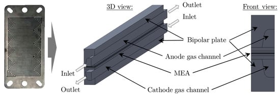 Therefore, most CFD models of fuel cells simulate only a single gas channel including the associated regions of the MEA (cf. [6,7,51,52,53,54,55,56,57,58,59,60,61,62,63,64]). Multiple parallel single channels are also conceivable (cf. [65,66,67]). Due to the aforementioned computational time constraints, fuel cell stacks cannot be modeled as a complete entity. However, Luo et al. reduce three cells of a stack to a single channel each, allowing simulation of heat transfer between individual cells in one model [68].