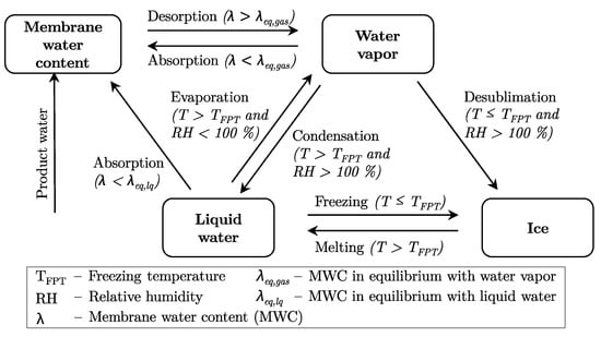 Depending on the operating temperature and pressure in the cell, water can exist in all three aggregate states. In addition, dissolved water is present in the membrane [49]. In Figure 2, the different states of water and the phase changes between each state implemented in the CFD model are shown graphically. The product water is formed in the dissolved state in the membrane fractions in the CCL. Due to the very small pore radii of the porous diffusion layers and catalyst layers, the surface tension of the water causes the freezing point to be depressed [4]. As a result, the temperature at which liquid water freezes into ice is determined by [58]: