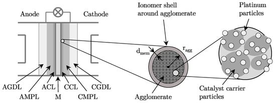 The catalyst layer of a PEM fuel cell consists of agglomerates of carbon particles, on whose surface are platinum particles and parts of the ionomer of the membrane [80]. Simplifying, the agglomerates can be modeled as spheres, on the surface of which the platinum is distributed. The agglomerates are surrounded by a uniform layer of ionomer. For the electrochemical reaction, the oxygen in the CCL must first dissolve in the ionomer shell and then diffuse through it to the platinum surface. The behavior of the fuel cell is strongly determined by these mass transfer resistances. The described structure of the agglomerate model is shown in Figure 3.