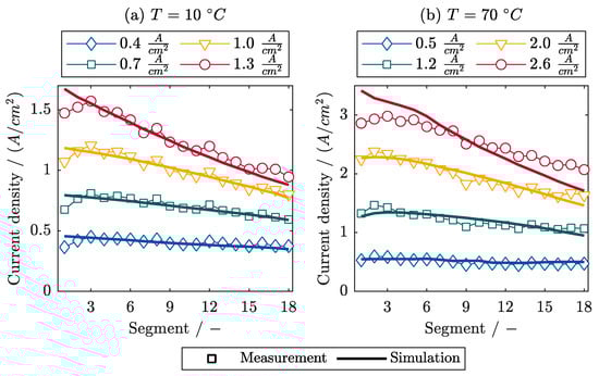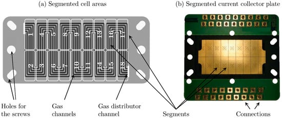For a better understanding of the processes taking place inside the cells during a frost start, it is useful to measure the current density or also the high frequency resistances (HFR) locally. The measurement of the current density distribution is basically possible in several ways. In all cases, the flow field on the anode or cathode side must be divided into elements of equal size that are electrically isolated from each other [25]. The current density can then be measured directly in the segments via a so-called printed circuit board (PCB), which replaces the current collector plate [26]. Alternatively, the segmented currents can be determined via electrical resistors at the segments by measuring the voltages dropping across them or with the help of Hall sensors. To do this, the resistors or Hall sensors must be mounted between the segmented flow field and the current collector plate [27,28,29]. For more information on segmented measurements on fuel cells, see the paper by Perez et al. [29]. Studies of fuel cells using the segmented measurements of current densities or HFRs can be found, for example, in [30,31,32,33,34,35].