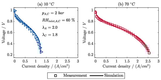 The model is calibrated so that the simulated polarization curves match the measured ones as closely as possible at all operating temperatures. For this purpose, the values of some parameters, which are not precisely known for the fuel cell, must be adjusted. Four parameter values are adjusted for calibration, which are shown in Table 3.