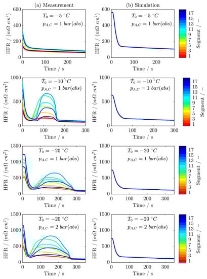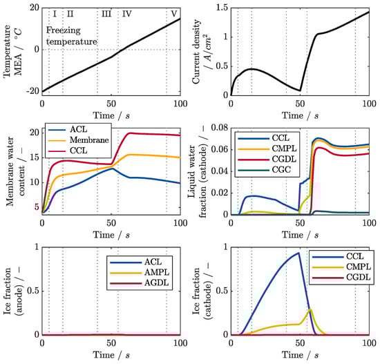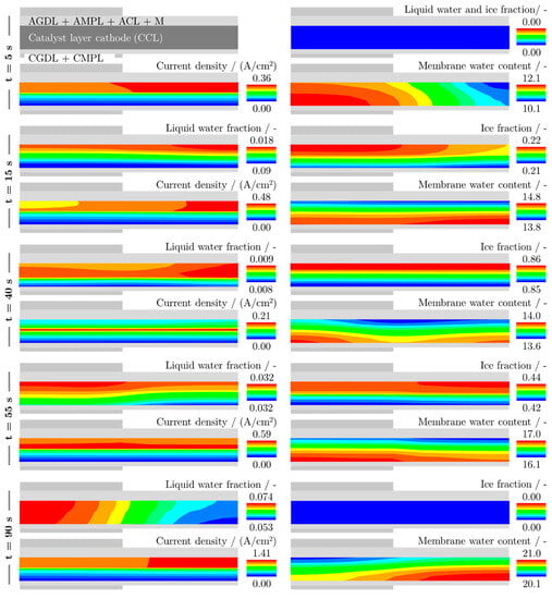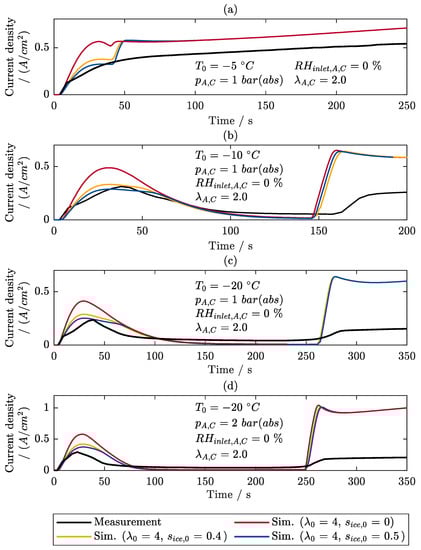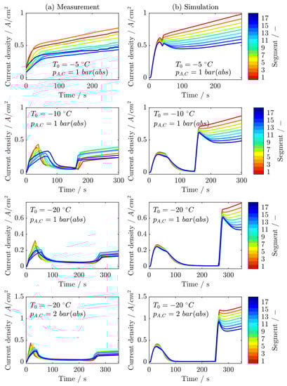 The literature review shows that although there are many studies dealing with modeling of the local processes inside the cell during frost starts, these models are not extensively compared with measured data (cf. [6,54,57,60,66,69,70]) or only simple validations are carried out (cf. [53,55,58,59,62,63,64,68]). The only validations with measurements of local current densities can be found in the studies by Hakenjos et al. and Fink et al. However, these researchers only deal with static operating points and not with frost starts or other transient operations [50,71].