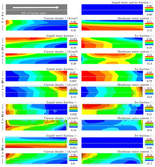 Since water is the only exhaust gas produced during operation of a PEM fuel cell, it can freeze to ice at operating temperatures below the freezing point of water. Ice lenses hinder gas transport to the catalyst layers, reducing fuel cell performance, efficiency, and lifetime [4]. As a result, frost starts without external supply of heat below −10 °C are generally not possible [5]. In addition, ice leads to mechanical stresses on the cell layers. High local mechanical stress peaks can exceed the allowable material stresses, leading to permanent damage or even destruction of the cells [6]. Thus, to understand and improve the frost start behavior, a thorough understanding of the processes in the cells during the start procedure is necessary.