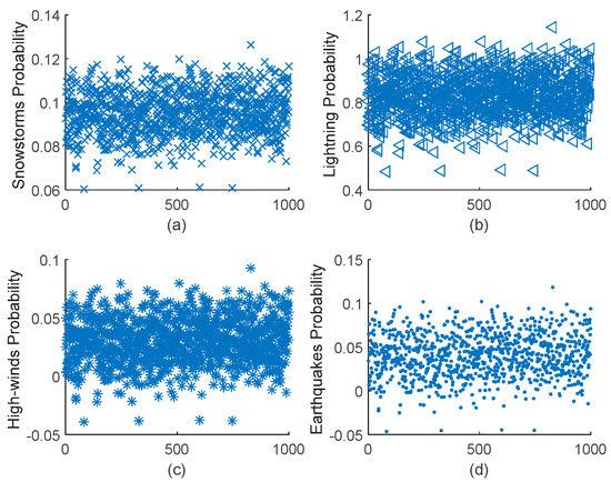 Monte Carlo stochastic simulation of the four disaster probabilities. (a) Monte Carlo simulation of snowstorms line fault tripping probability. (b) Monte Carlo simulation of lightning line fault tripping probability. (c) Monte Carlo simulation of high-winds line fault tripping probability. (d) Monte Carlo simulation of earthquakes line fault tripping probability.