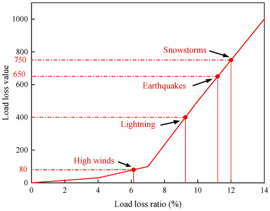 According to the statistics, the operation of transmission lines in the region is mainly affected by natural disasters such as snowstorms, lightning, high winds, and earthquakes. This paper is based on the Monte Carlo method to simulate the tripping of transmission lines under different natural disasters. According to the distribution function of tripping situations, 1000 tripping frequencies are randomly generated. The frequency approximation is used to replace the probability when calculating the probability of the tripping of transmission lines under different natural disasters. Figure 2 shows the Monte Carlo-simulated line trip probabilities for the four natural disasters. According to Bernoulli’s Law of Large Numbers, the probability of a line trip in this region by a natural disaster, in particular, snowstorms, lightning, high winds, and earthquakes, is 0.0953, 0.8288, 0.0321, and 0.0438. Using Table 2, combined with the actual situation of load loss under the four disaster types in the region, the load loss under the different disasters is scored using linear interpolation to obtain the line fault transmission capacity loss values , shown in Figure 3. Snowstorms correspond to the second-grade power supply. Thunderstorms and earthquakes correspond to the first-grade power supply. Windy weather corresponds to the general period power supply. Noting the periods corresponding to the occurrence of the different disasters, the risk period coefficient , for each disaster is taken from Table 3. The above data are shown in Table 6.