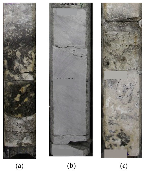 Rocks of carbonate strata of the Yelets and Zadonian age (Devonian) are characterized by core predominantly in their upper part (D3el) (Figure 2). According to the core, the formation is mostly limestone with areas of abundant secondary dolomitization. Leaching is widespread, with caverns of various sizes ranging from leaching pores to large voids up to several centimeters in diameter. Leaching has also been observed in limestones, but cavernosity is particularly strong in dolomites.