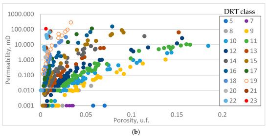 Table 1 shows an increase in the determination coefficients when using the DRT approach. Determination coefficients for all classes, except for class 18, are higher than 0.8. For class 18, the determination coefficient is 0.58; however, this type belongs to the fracture type and is characterized by a large scatter of properties, and the number of values is only six. This methodology allows us to obtain high coefficients of determination but distinguishes many classes, which will complicate the distribution of rock types in the geomodelling process.