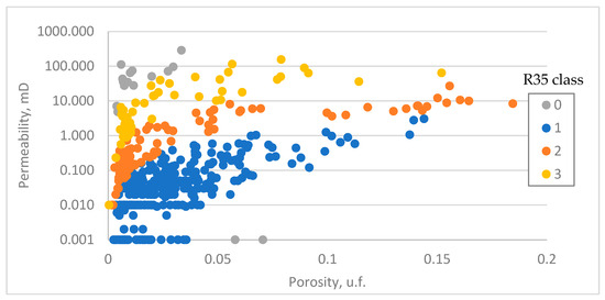 The pore channel radius corresponding to 35% saturation of the pore volume with the nonwetting phase (R35) was calculated. A classification based on the R35 parameter has been carried out, but the method will not produce a reliable reservoir typology with high coefficients of determination between the parameters in each class.
