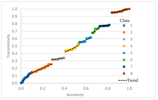 Next, the typing was performed using the Lorenz plots method. Lorenz curves are an alternative graphical representation of the distribution function to estimate the degree of heterogeneity of a reservoir [36,39,40]. The degree of heterogeneity is assessed by comparing the areas under the curves with the area of a triangle cut off by a line of equal values. The accumulated porosity values (Storativity) are plotted on the abscissa axis, and the corresponding accumulated permeability values (Transmissivity) are plotted on the ordinate axis.