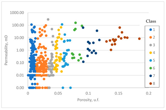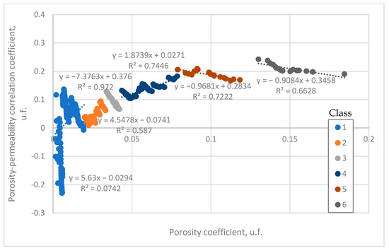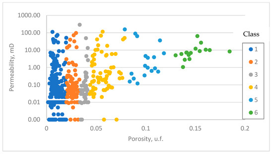 In Figure 9, six types of rocks can be distinguished according to changes in trends. Determination coefficients were calculated for the classes, ranging from 0.07 to 0.972. The first class is characterized by a low coefficient of determination, as the relationship between permeability and porosity values is practically absent and unstable. This class can be attributed to the matrix component with the inclusion of samples with fractures and samples with practically no reservoir properties. For the second class, there is an upward trend in the correlation value between the parameters, but some samples, on the contrary, are out of the trend, probably because of the inclusion of fractures in the matrix type of the reservoir. For the third class, with increasing porosity values, there is a decreasing trend in the correlation coefficient between porosity and permeability, i.e., there are samples with fractured reservoir type—with generally low porosity, a number of samples have high permeability. The next class, four, is characterized by a general growth trend in the porosity–permeability relationship. This class may be classified as a pore reservoir. The fifth class, on the contrary, manifests a general downward trend of porosity-permeability relationship, and the cavernous component can be observed. The last class also belongs to the pore-cavernous or pore-cavernous-fracture type.