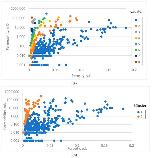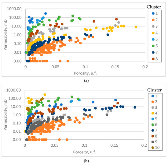 From Table 2, it can be concluded that, in general, it was possible to improve rock typing compared to standard approaches (GHE, DRT, R35). When using the EM clustering algorithm, determination coefficients for all cases are higher than 0.57, even for classes characterizing the fractured type of reservoir. Based on the analysis of Table 2, differences in approximation formulas are observed. For calculation with the number of clusters equal to eight, all dependencies by classes are approximated linearly with high coefficients of determination. Essentially, this approach simplifies the dependencies between permeability and porosity, but in the modeling phase, it can have the effect of overestimating the permeability. Generally, exponential relationships are adopted to approximate porosity and permeability relationships.