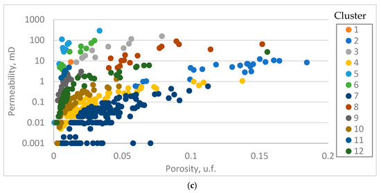 For calculations with the number of clusters equal to 12, the obtained coefficients of determination are lower, but nevertheless not lower than 0.57. Three classes characterizing pore, pore-cavernous, and cavernous-pore reservoir types are also distinguished, which are approximated linearly.