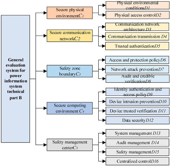 The main research object of this paper is the power information system, and the power information system security evaluation index system is constructed in combination with the classified protection 2.0 standard, the power information security level evaluation index (GB/T 32351-2015) [28], and the power information system security inspection specification (GB/T 36047-2018) [29]. The index system is divided into three levels: target level (B), primary index (C), and secondary index (D).