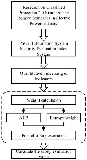 Most of the above studies focus on the index system summarized from the basic attributes of information security (confidentiality, integrity, availability, authenticity, and controllability), and the degree of integration and applicability of the current classified protection 2.0 system is not high. Most of them only use highly subjective evaluation methods such as the AHP (analytic hierarchy process), and the quantification of objective indexes is relatively vague [22,23,24,25]. Therefore, this paper is based on the classified protection 2.0 evaluation system combined with the existing safety inspection standards of the power system to establish a safety index system suitable for the power information system. It also quantitatively analyzes the indexes through a combination of subjective and objective quantitative methods [26]. The AHP entropy method is used to obtain the combined weight of the evaluation index system, and then the TOPSIS algorithm is used to realize the overall security evaluation of the power information system [27].