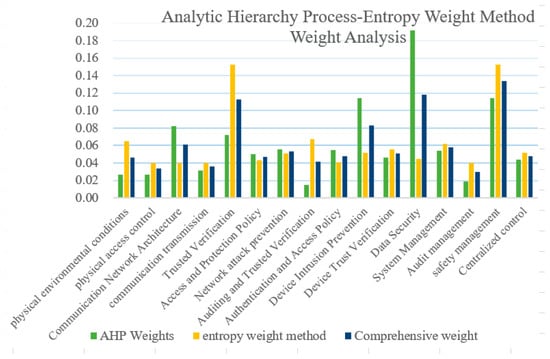 From the perspective of the first-level indexes, the weight of the AHP is not much different from the final comprehensive weight. The weight proportion of the secure computing environment is slightly reduced, but it still occupies the highest weight, which is consistent with the weight ranking obtained by expert evaluation.