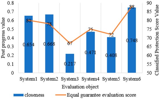 Combined with the analysis from a practical point of view, several secondary indexes with a large proportion of comprehensive weight were analyzed: safety management , trusted verification , and network attack prevention . The index evaluation of system 6 is the optimal solution or close to the optimal solution, and the comprehensive evaluation result has certain rationality. The graded protection test scores of the six power information systems selected in this paper were compared and analyzed with the TOPSIS post-progress calculation results, as shown in Figure 10. The results show that the TOPSIS-based comprehensive evaluation results are basically consistent with the grade protection evaluation results, which confirms the scientificity and practicability of the evaluation model.