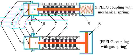 Schematic diagrams of single-cylinder/single-piston FPELGs. 1—exhaust port; 2—spark plug; 3—engine piston; 4—cylinder; 5—fuel injector; 6—scavenging port; 7—stator; 8—mover; 9—mechanical spring; 10—gas spring.