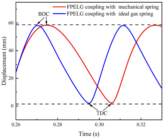 The piston displacement profiles of the FPELG coupling with the mechanical spring and the gas spring are displayed in Figure 3. It is worth noting that the piston of the FPELG coupling with the gas spring reaches the TDC earlier than that of the mechanical spring. The reasons for this are that in order to achieve the same length of the piston motion from TDC to BDC (Bottom Dead Center) in this paper, the equivalent stiffness of the gas spring needs to be stronger than that of the mechanical springs. As a result, during the single cycle process, the stored energy of the FPELG coupling with the gas spring is greater than that of the mechanical spring. It implies that the rebound force from the gas spring acting on the piston is stronger, compared to that of the mechanical spring. Consequently, the piston operation frequency of the FPELG coupling with the gas spring is faster than that of the mechanical spring. It can be seen that the piston dynamics of the FPELG are significantly influenced by the rebound parameters of the rebound device.