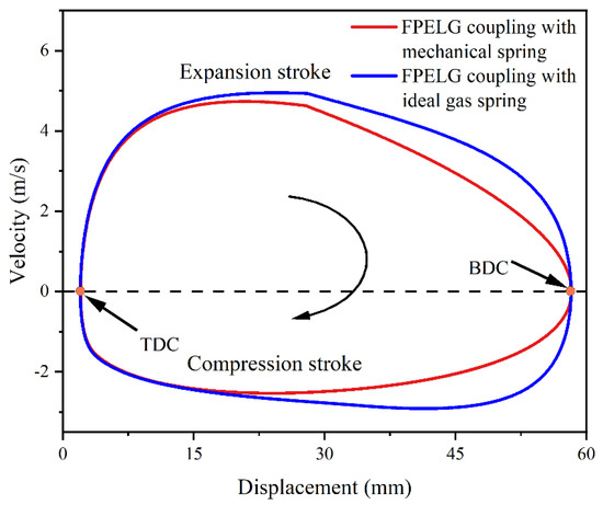Figure 5 reveals the piston displacement–velocity profiles of the FPELG coupling with the mechanical spring and the gas spring. The negative velocity of the piston indicates the piston of the FPELG operates during the compression stroke, which occurs from BDC to TDC. Similarly, the positive value of the piston velocity means the piston of the FPELG operates during the expansion stroke, which moves from TDC to BDC. It can be observed that, regardless of whether the FPELG is coupled with the gas spring or the mechanical spring, the piston peak velocity of the FPELG during the expansion process is significantly faster than that during the compression process. As discussed previously, regardless of whether the FPELG is coupled with the gas spring or the mechanical spring, the piston acceleration of the FPELG during the expansion process is significantly greater than that during the compression process. In addition, since the residence duration of the piston at the TDC is much shorter than that at the BDC, it means that the FPELG piston is present for a shorter period near TDC, which has the potential advantage of reducing the heat transfer losses and NOx emissions.