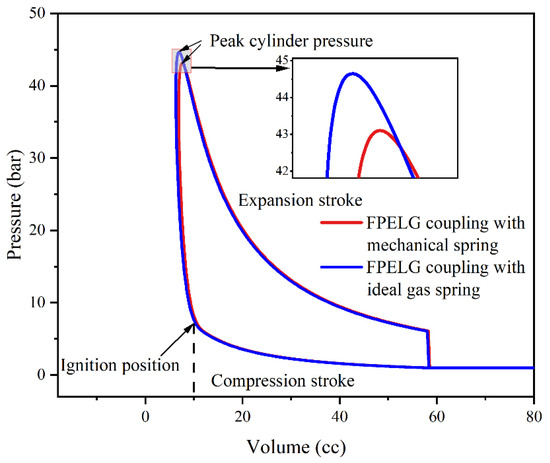 The pressure–volume diagrams of the FPELG coupling with the mechanical spring and the gas spring are illustrated in Figure 6. It can be observed that regardless of whether the FPELG is coupled with the gas spring or the mechanical spring, the combustion process is similar to the constant-volume process. However, the peak pressure in-cylinder of the FPELG coupling with the gas spring is higher than that of the mechanical spring. This is due to the fact that the kinetic energy of the piston of the FPELG coupling with the gas spring is greater than that of the mechanical spring, as discussed above.