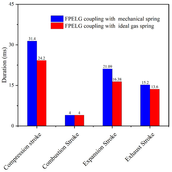 In order to quantitatively compare the engine performances of the FPELG coupling with various types of rebound devices, the duration of each process is displayed in Figure 7. Similar to the conventional reciprocating engine, the durations of each process, including the compression process, the combustion process, the expansion process and the gas exchange process, are significantly different. From Figure 7, it can be seen that the duration of the compression process for the FPELG coupling with the gas spring is shorter than that of the mechanical spring. Due to the same physical structure of the free piston engine, the piston velocity of the FPELG coupling with the gas spring is faster than that of the mechanical spring when the stroke length is constant. On the other hand, regardless of whether the FPELG is coupled with the gas spring or the mechanical spring, the combustion duration remains the same. It is worth noting that the compression ratio (TDC is the same) and the initial conditions are the same for both the FPELG when coupled with the gas spring and the mechanical spring. According to the operating principle of the FPELG, for the duration of the expansion process, the piston velocity profile is asymmetric, which means that the duration of the expansion process is shorter than that during the compression process. Furthermore, according to the properties of the gas spring and the mechanical spring, as the resistance force from the gas spring is smaller than that from the mechanical spring, the expansion duration of the FPELG coupling with the gas spring is shorter than that of the mechanical spring. In other words, unlike the mechanical spring, the equivalent stiffness of the gas spring is nonlinear. As the volume of the compression chamber of the gas spring decreases, the pressure increases, and hence the equivalent stiffness of the gas spring changes throughout the entire expansion process, increasing from a small value to a large value. On the contrary, the stiffness of the mechanical spring remains constant throughout the whole operating process. With regard to the duration of the gas exchange process, it can be observed that as the piston operation frequency of the FPELG coupling with the gas spring is faster than that of the mechanical spring, the gas exchange duration of the FPELG coupling with the gas spring is shorter than that of the mechanical spring. And due to the same physical structure of the free piston engine, the piston operation distance during the gas exchange stage is constant.