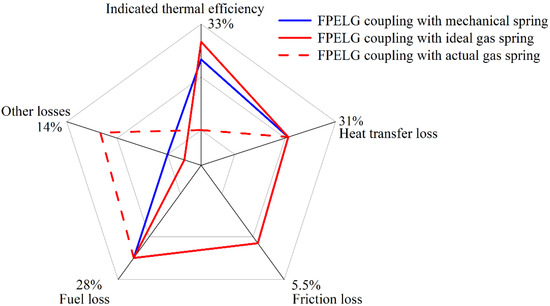 The energy distribution of the FPELG coupling with various types of rebound springs is depicted in Figure 8. It is found that the indicated thermal efficiency of the FPELG coupling with the mechanical spring, the ideal gas spring, and the actual gas spring is 32%, 32.5%, and 30%, respectively. It is worth noting that the indicated work of the FPELG coupling with the ideal gas spring is roughly the same as that of the mechanical spring, and the input energy is also the same. Nevertheless, the indicated thermal efficiency of the FPELG coupling with the actual gas spring is less than that of the ideal gas spring. This discrepancy can be attributed to the gas leakage inherent of the actual gas spring, which diminishes its rebound force. Furthermore, due to the uniform construction of the free piston engine, the heat transfer loss of the FPELG coupling with various types of rebound devices is equivalent. And the same holds true for the fuel combustion loss and the friction loss. Consequently, compared with the mechanical spring and the ideal gas spring, the other loss of the FPELG coupling with the actual spring is much higher.