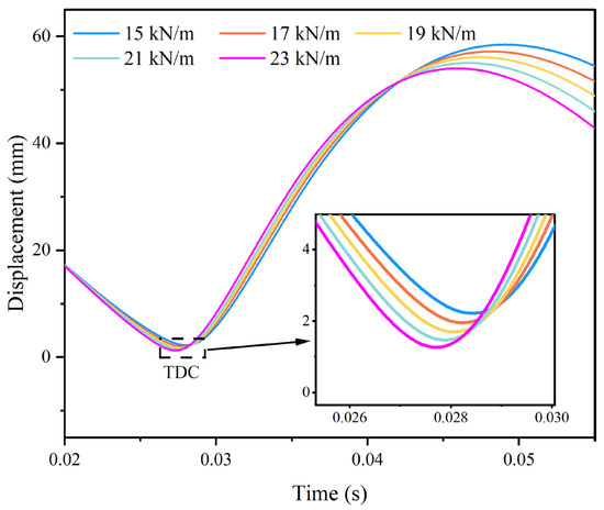 The piston displacements of the FPELG coupling with the mechanical spring under various stiffness are depicted in Figure 9, with a stiffness range of 15 kN/m to 23 kN/m and an interval of 2 kN/m. It is obviously observed that the TDC position is positively correlated with the stiffness of the mechanical spring. As a result, the compression ratio increases as the stiffness of the mechanical spring increases, which improved the combustion efficiency of the free piston engine. However, the operation stroke length of the piston is inversely proportional to the stiffness of the mechanical spring. In addition, the operation frequency of the piston increases with the increase in the stiffness of the mechanical spring. Due to the increase in the stiffness of the mechanical spring and the rebound force, the piston velocity increased during the compression process.