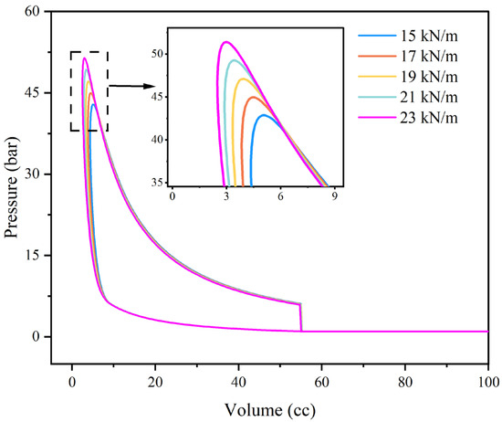 Pressure–volume diagrams of the FPELG coupling with the gas spring under various initial gas pressures.