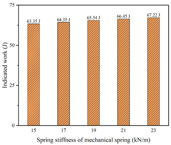 In order to directly evaluate the engine performances of the FPELG coupling with various stiffnesses of the mechanical spring, the pressure–volume diagrams are depicted in Figure 10. It can be observed that as the stiffness of the mechanical spring increases, the combustion process of the engine is nearly closed to the isovolumetric process. In addition, the area covered by the pressure–volume diagram became large with the increase in the stiffness of the mechanical spring. It means that the indicated work of the engine, i.e., the pressure–volume-diagram-covered area, is positively relative to the stiffness of the mechanical spring, as shown in Figure 11. Furthermore, when the input energy is constant, the indicated thermal efficiency of the FPELG also increased. These results demonstrate that the stiffness of the mechanical spring is a critical factor influencing the performances of the PFELG coupling with the mechanical spring.