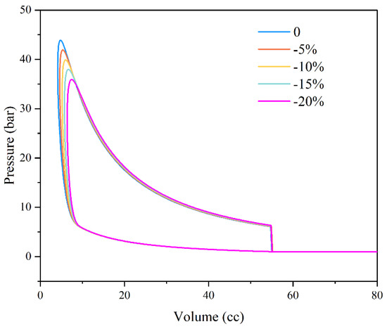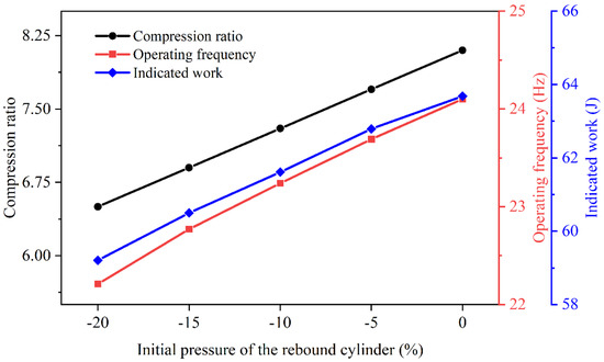 Similar to the impact of the mechanical spring as the rebound device, the rebound force from the gas spring has a direct effect on the dynamics of the piston and engine characteristics of the FPELG coupling with the gas spring. According to the operating principle of the gas spring, the rebound force from the gas spring depends on the initial gas pressure. As a result, the performance sensitivity of the FPELG under various initial gas pressures of the gas spring is analyzed. In addition, the dynamics of the piston and engine characteristics are compared with the initial gas pressure of the gas spring range from −20% to 0% (which represents 1 bar) with an interval of 5%, while other parameters are constant. Figure 12 reveals that the compression ratio of the free piston engine is positively correlated with the initial gas pressure of the gas spring. This is because the equivalent stiffness of the gas spring increases with the increase in the initial gas pressure. Therefore, the changing trend of the gas spring with various initial gas pressures is similar as those of the mechanical spring with various stiffnesses. Furthermore, as the initial gas pressure of the gas spring increases, the operating frequency of the piston also increases.