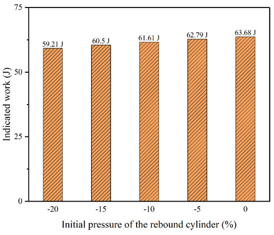 The pressure–volume diagram of the FPELG coupling with the gas spring under various initial gas pressures is shown in Figure 13. It is worth noting that as the initial gas pressure of the gas spring increases, the combustion process of the free piston engine is nearly closed to the isovolumetric process. According to the above discussion, the increase in the initial gas pressure of the gas spring is similar to the increase in the stiffness of the mechanical spring. Furthermore, the indicated work of the free piston engine, i.e., the pressure–volume-diagram-covered area, became large with the increase in the initial gas pressure of the gas spring, as shown in Figure 14. And when the input energy is constant, the indicated thermal efficiency of the FPELG also increases. Hence, the initial gas pressure of the gas spring plays a pivotal role in determining the performances of the PFELG coupling with the gas spring.