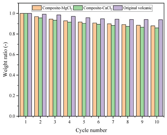 Under the same conditions as in the previous preparation process, the prepared composites were tested for 10 adsorption/desorption cycles. The water absorption test was at 30 °C and 60% humidity, while drying and TG-DSC were in the 20–250 °C temperature range. In addition, considering the degradation of volcanic [,], a natural material, a cycle stability test of it was also added. The samples after each cycle were weighed and compared with the initial samples, and the results are shown in Figure 11. The weight of both composites dropped significantly during the first several cycles. From the sixth cycle, the weight drop of composite-MgCl2 tends to be flat, and the weight change decreases. Similarly, the weight of volcanic hardly changed after the fifth cycle. But the weight change of composite-CaCl2 does not significantly decrease until the eighth cycle. Finally, after 10 cycles, the weight of the volcanic is stable at 94.01% of the initial weight, and the weight of composite-MgCl2 and composite-CaCl2 decreased by 12.08% and 14.08%, respectively.