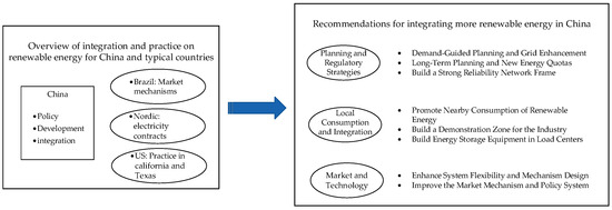 This study overviews international practices of renewable energy integration, exploring cases from Brazil, the Nordic region, and the USA. From Brazil’s innovative contract markets to the Nordic region’s multifaceted spot market and the USA’s creative pricing mechanisms, diverse strategies are examined. Drawing inspiration, tailored recommendations are presented for China, encompassing dynamic demand alignment, structured sustainability paths, enhanced grid security, localized consumption, and adaptable trading. This synthesis of global insights aims to guide China’s unique journey in addressing renewable energy challenges. Figure 1 presents a diagrammatic sketch of the research.