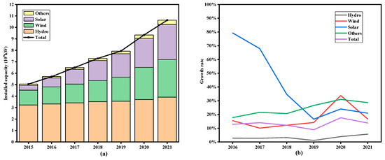 Installed capacities (a) and growth rate (b) of renewable energy in China from 2015 to 2021.
