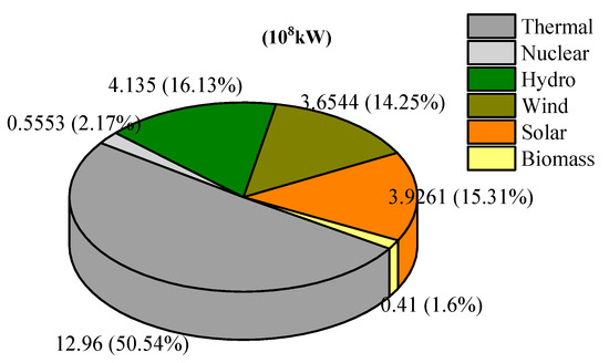 Figure 3 depicts the proportion of installed capacity for various energy sources in 2022. The proportion of renewable energy’s installed capacity had increased to 47.3%. As the country with the largest renewable energy production capacity, China’s utilization of renewable energy is constantly improving. In 2022, China produced 2.7 trillion kWh of renewable energy, with a year-on-year increase of 1.7%, accounting for 31.6%% of the total electricity generation [16]. By the end of July 2023, China’s renewable installed capacity reached 1.32 billion kW, accounting for 48.7% of the total installed capacity, including 418 million kW of hydropower, 389 million kW of wind power, and 470 million kW of solar power [17]. The total installed capacity of hydro, wind, and solar power is the largest in the world, and the role of renewable energy in replacing fossil fuel energies is increasingly prominent.