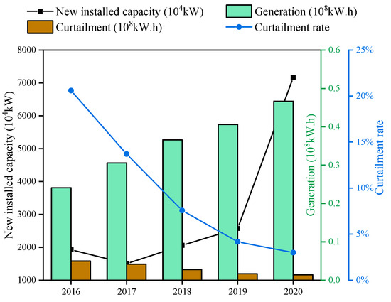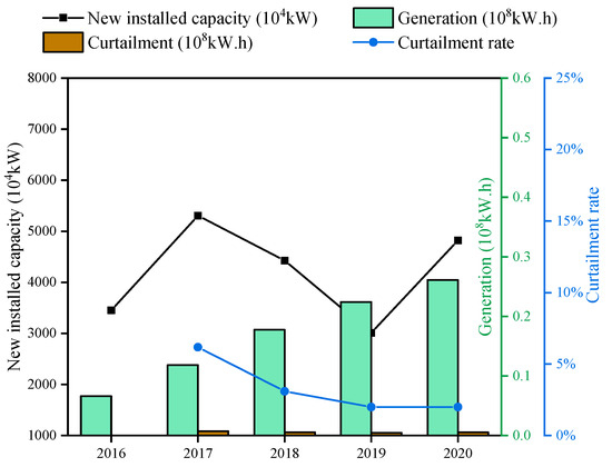 In 2020, the installed capacity of wind power connected to power grids increased by 71.7 million kW, up by 178% year on year, and the total installed capacity of wind power was 282 million kW, accounting for 10.4% of the total installed capacity in China. The wind power generation reached 466.5 billion kWh, up 15% year on year, accounting for 21.2% of the total generation. During the 13th Five-Year Plan period, the average utilization hours of wind power in China increased significantly, from 1728 h in 2015 to 2082 h in 2019, with a cumulative increase of 20.48%. Yunnan Province has the most average utilization hours of wind power in China, at 2808 h, followed by Fujian Province and Sichuan Province. Meanwhile, introducing renewable energy quotas and a moratorium on new wind power projects in areas with high wind curtailment has helped ease the wind curtailment and power rationing across the country. Figure 4 illustrates the new installed capacities, generations, curtailment, and curtailment rates of wind power during the 13th Five-Year Plan in China. New installed capacity and generation for wind power continued to increase constantly, while curtailment and the curtailment rate gradually reduced. The curtailment rate for wind power in 2020 reached to 3%, indicating that the consumption of wind power has continued to improve [14,19,20,21,22].