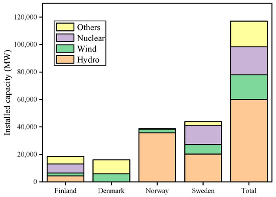 The Nordic region comprises five countries: Sweden, Norway, Finland, Denmark, and Iceland. Except for Iceland, whose grid is relatively independently operated, the other four countries have established a transregional power market through power grid interconnection [39]. Nord Pool is the power exchange in charge of the market trading, while each of the four national grid companies is responsible for the power dispatch. The total installed capacity in the Nordic electricity market has reached 108 GW, and the total power generation in 2019 was 403.78 billion kWh. Figure 6 shows the Nordic countries’ installed capacity, indicating apparent complementarity in the power structure until the end of 2020. At the start of 2022, the power supply in Norway had a total installed production capacity of 38,744 MW and a total normal annual production of 154.8 TWh. [40]. In recent years, Denmark has made great efforts to develop renewable energy, mainly in wind power, of which the generation in 2019 reached 16.15 billion kWh, accounting for 52.7% of the country’s total electricity generation and surpassing a historical share of 50% for the first time. Sweden and Finland have diverse power structures [41], among which the installed capacity of hydro, thermal, and nuclear power in the country accounts for 41.5%, 22.6%, and 18.7 of the total installed capacity, respectively. The installed capacity of Finland is mainly thermal power, while there is a slight difference between hydropower and nuclear power, accounting for 52.4%, 19.1%, and 16.2, respectively. The four Nordic countries started designing their power grid interconnection very early, considering frequent transnational power transactions when the power grid construction was planned. Impressively, transmission congestion in the four Nordic countries is not a problem, due to the nationalization of power resources and central planning of power grid construction.